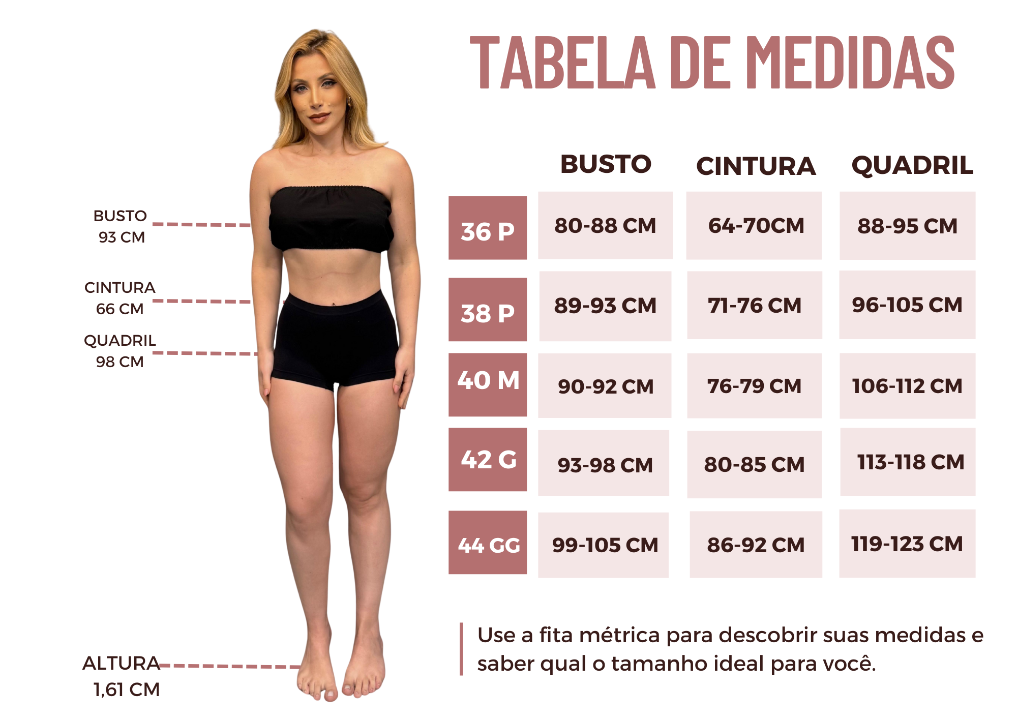 Use nossa tabela de medidas como referencia para te auxiliar.